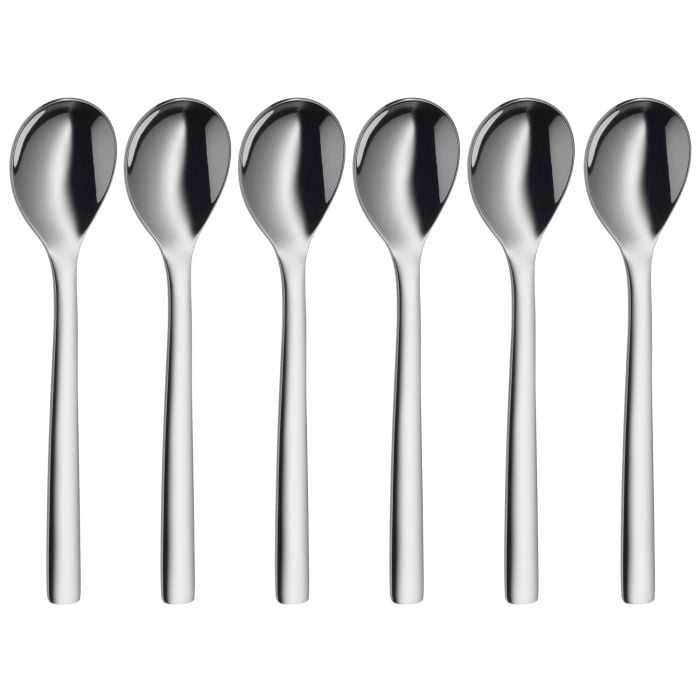 Набор из 6 ложек для яиц WMF Nuova (12.9146.6040) в подарочной коробке. Столовые приборы изготовлены из полированной нержавеющей стали 18/10 Cromargan protect®, устойчивы к повреждениям и царапинам и кислотам, не впитывают запахи. Благодаря своей длине они хорошо вписываются в маленькие чашки.