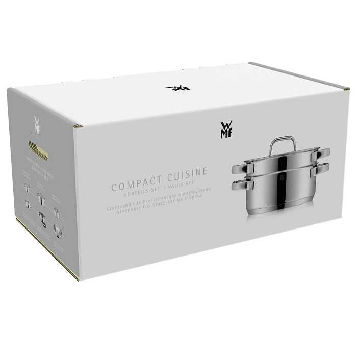Набір каструль WMF Compact Cuisine з 5 предметів (0790556380) рішення для власників красивих і водночас маленьких кухонь. Ця серія призначена для невеликих приміщень – для зручного зберігання.