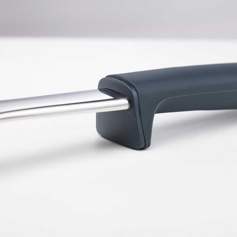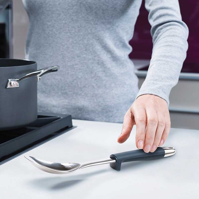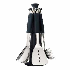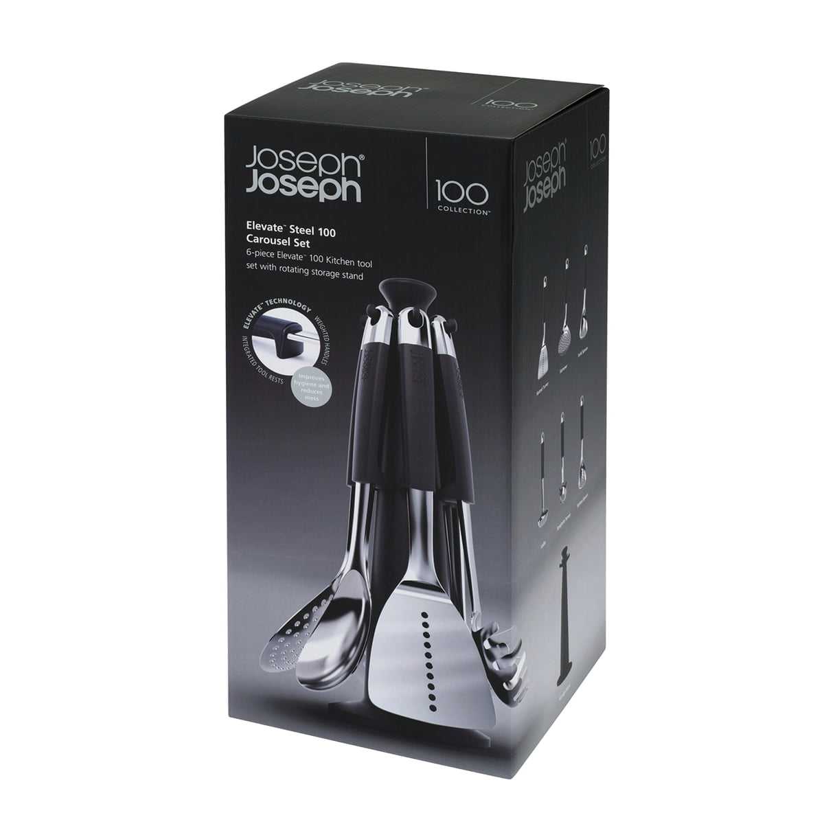 Набір кухонного приладдя Joseph Joseph Elevate™ 100 (95029) - це елегантний набір, що складається з шести кухонного приладдя, яке тримається на підставці, що обертається, і завжди під рукою для приготування, випічки, приготування та подачі їжі. У варіанті 100 від Joseph Joseph кухонні гаджети з ергономічними ручками із чорного силікону та поверхнями з полірованої нержавіючої сталі. Таким чином, набір буде привабливим на будь-якій кухні. Набір складається з ополоника, перфорованого ковша, перфорованого шпателя, ложки для спагетті, ложки та шпателя. Інструменти мають отвір у ручці, щоб їх можна було зручно повісити на підставі каруселі Elevate. Крім того, кухонні інструменти мають збалансовану ручку та спеціальну вбудовану полицю. Вага ручки штовхає кухонний інструмент догори, коли він опускається і не стосується поверхні кухонної стільниці. Уривки їжі залишаються на ополонику, лопатці або ложці і не потрапляють на робочу поверхню кухні, що полегшує збирання та покращує гігієну при приготуванні їжі.