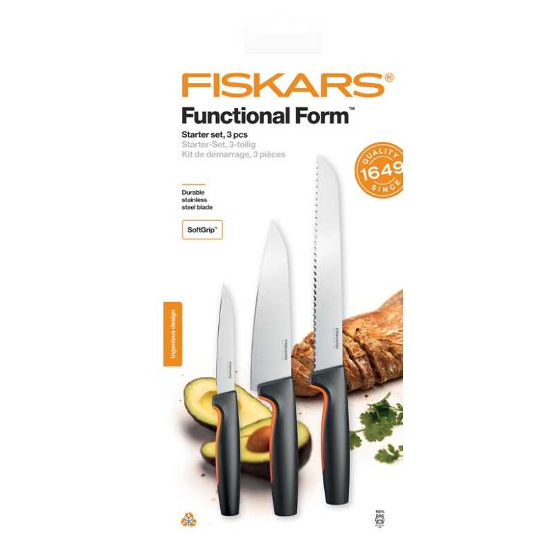 Набір ножів Fiskars Functional Form™ Starter set (1057559) включає три основні ножі: обробний, кухонний ніж середнього розміру та ніж для хліба, які можна використовувати на будь-якій кухні.