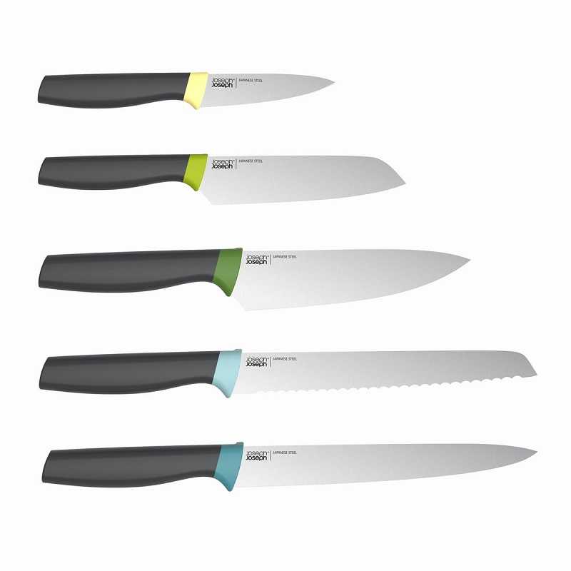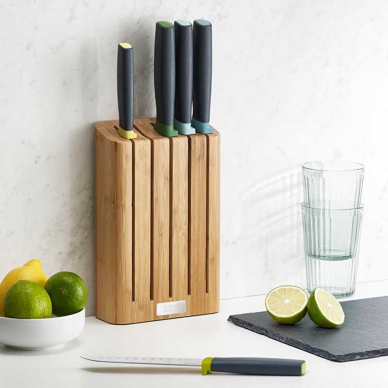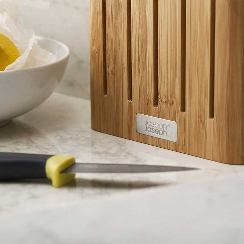 Набір ножів у блоці Joseph Joseph Elevate™ Bamboo (10300) включає набір необхідних кухонних ножів, кожен з лезом з японської нержавіючої сталі. Вузький бамбуковий блок займає набагато менше місця на робочій поверхні, ніж звичайний ножовий блок, має універсальні магнітні пази для ножів, які надійно утримують ножі на місці, також включає нековзні ніжки на підставі. У набір із 5 штук входять ніж для овочів 9 см, ніж Santoku 13 см, ніж кухаря 15 см, ніж для оброблення 20 см та ніж для хліба 20 см.