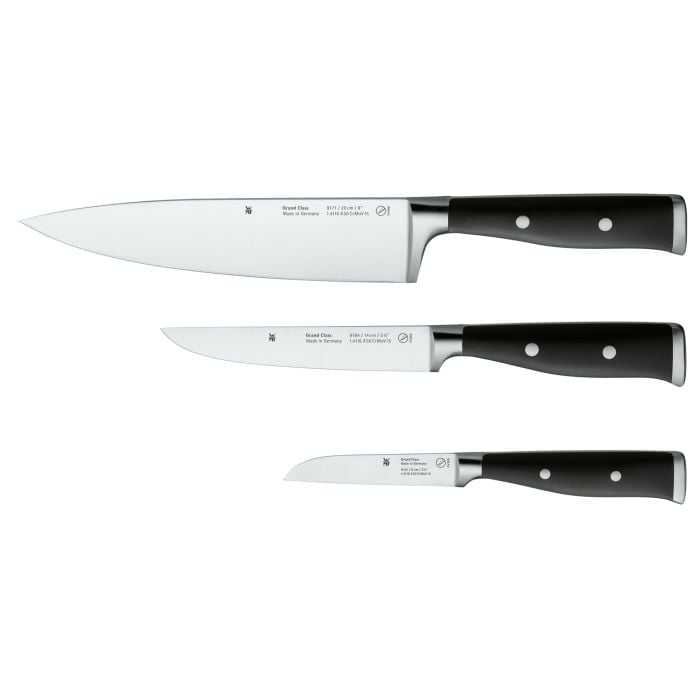 В комплекте: 1 нож для овощей, 1 поварской нож, 1 нож универсальный.