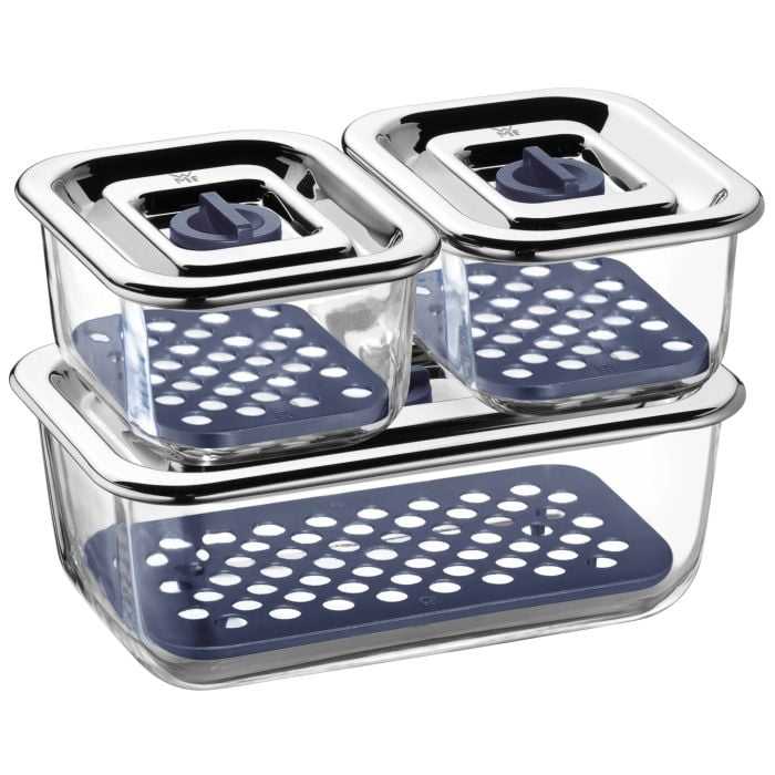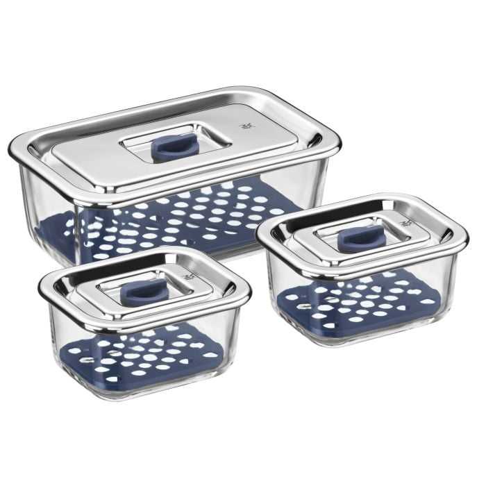 Набор пищевых контейнеров WMF Top Serve (06.5424.9999) состоит из 3-х стеклянных емкостей, каждая из которых оснащена силиконовой вставкой, позволяющей сохранять хранимые продукты / овощи / фрукты свежими в течение длительного времени. Высокое качество, функциональность и стойкость.
