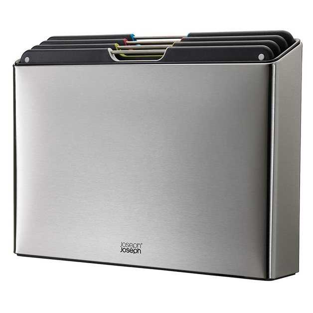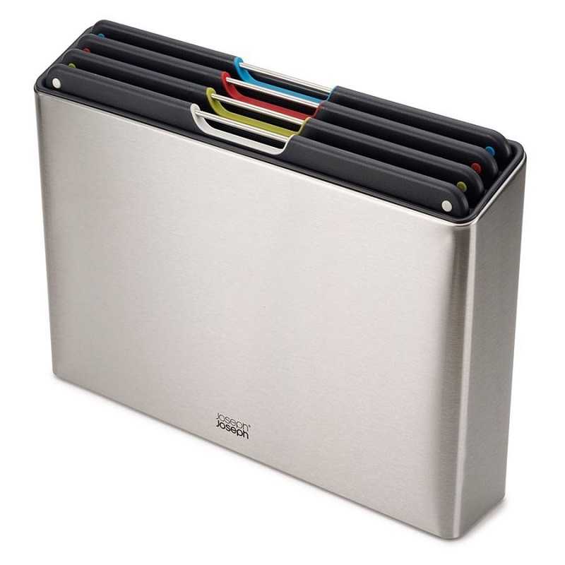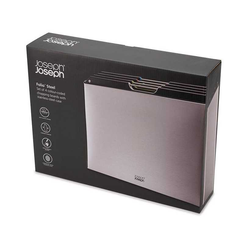Набір дощок Joseph Joseph Folio™ Steel (60170) складається з чотирьох великих обробних дощок і тримача. Нарізка риби, м'яса, курки, овочів та хліба на різних обробних дошках запобігає перехресному забрудненню. Кожна дошка має кольорове маркування для полегшення розбирання. Чотири дошки мають зручну для ножа текстуровану ріжучу поверхню з обох боків. Крім того, вони не містять бісфенолу А і мають протиковзкі ніжки, тому обробна дошка не рухатиметься під час різання продуктів. Після використання ці зручні інструменти можна просто мити в посудомийній машині. Після ополіскування ви можете легко зберігати їх у тримачі, що додається.