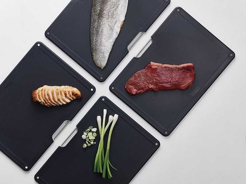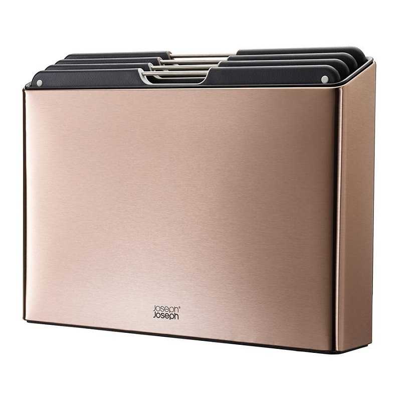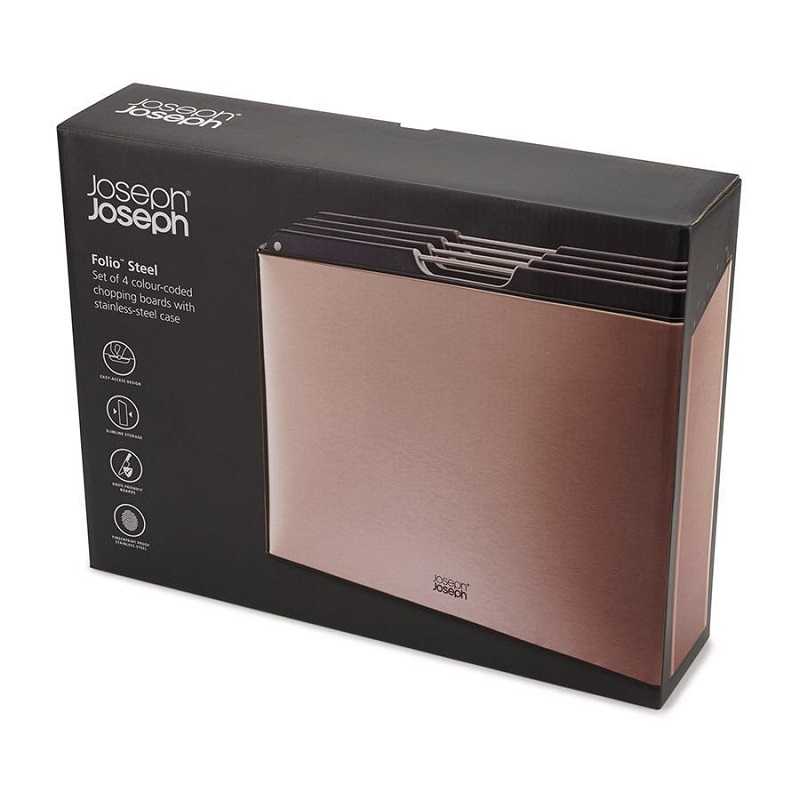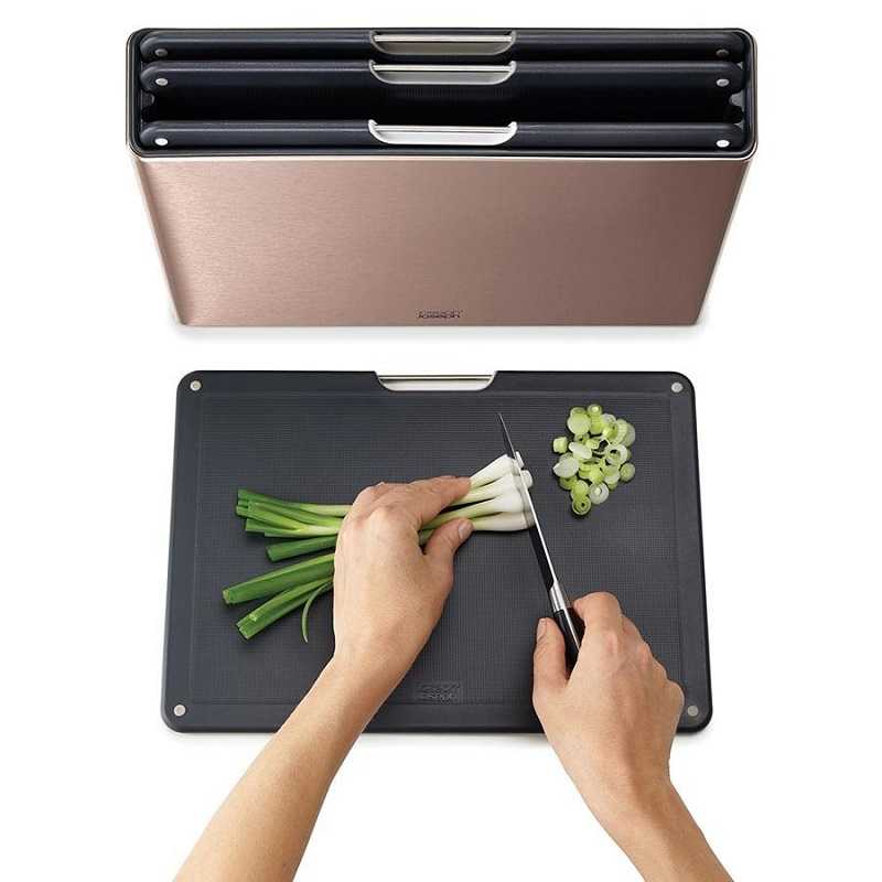 Набір дощок Joseph Joseph Folio™ Steel Rose Gold (60172) складається з чотирьох великих обробних дощок і тримача. Нарізка риби, м'яса, курки, овочів та хліба на різних обробних дошках запобігає перехресному забрудненню. Кожна дошка має кольорове маркування для полегшення розбирання. Чотири дошки мають зручну для ножа текстуровану ріжучу поверхню з обох боків. Крім того, вони не містять бісфенолу А і мають протиковзкі ніжки, тому обробна дошка не рухатиметься під час різання продуктів. Після використання ці зручні інструменти можна просто мити в посудомийній машині. Після ополіскування ви можете легко зберігати їх у тримачі, що додається.