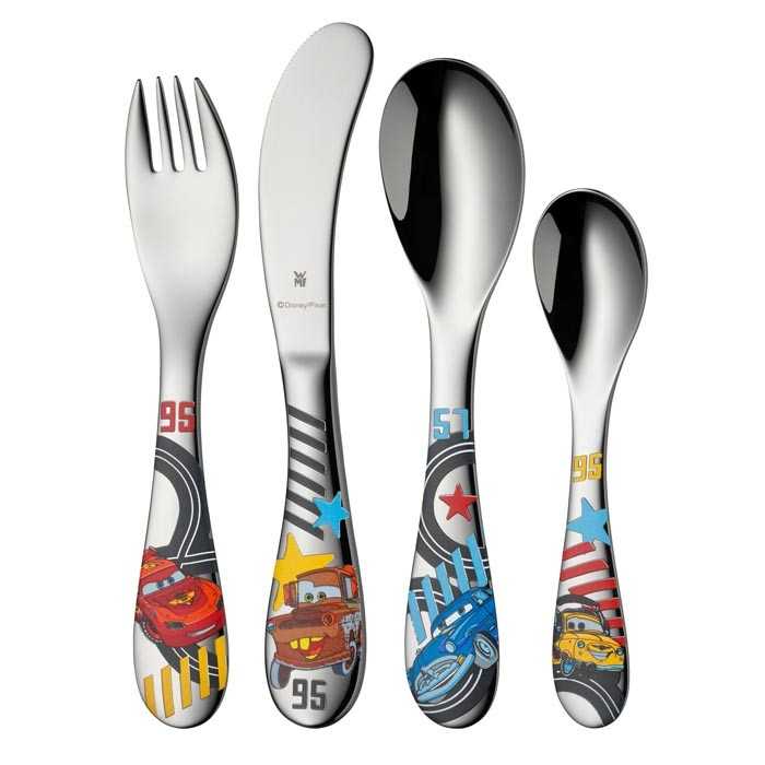 Автомобили, мультипликационные машины с личностями, голосами и историями придают этому детскому набору уникальный вид. Молния МакКуин и его друзья выбиты на концах ручек столовых приборов WMF Cars 2. Состоит из тарелки, чаши и столовых приборов нож, вилка, ложка, чайная ложк. Посуда изготовлена из фарфора, столовые приборы из полированной нержавеющей стали 18/10 Cromargan®, устойчивой к царапинам Cromargan® и органическим кислотам. Набор украшен персонажами мультфильма Walt Disney - поощряет молодежь, к еде.