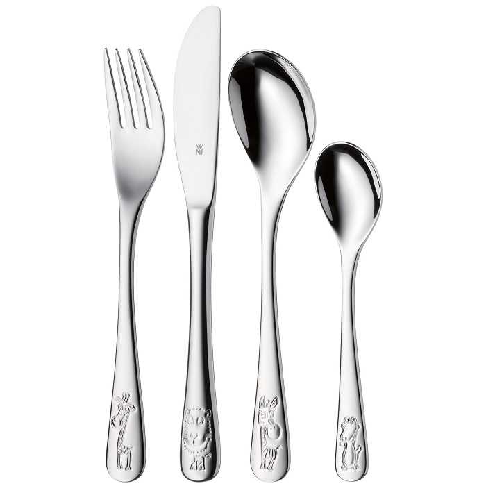 Набор столовых приборов для детей WMF Safari (12.8002.6040) 4 предмета в подарочной коробке. Каждый набор из четырех предметов включает в себя детский нож, большую и маленькую ложку, а также детскую вилку. Столовые приборы изготовлены из полированной нержавеющей стали 18/10 Cromargan®, устойчивой к царапинам Cromargan® и органическим кислотам. Набор украшен тисненым рисунком животных на ручках, он поощряет молодежь, к еде.