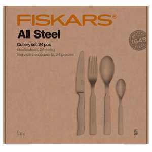 Набір столових приладів Fiskars All Steel 24 шт (1071626) із нержавіючої сталі, розрахований на шість осіб. Ідеально підходить для кожного будинку. Класичний стиль та висока якість. Кухонні столові прилади виготовляються із високоякісної нержавіючої сталі на фабриці Sorsakoski у Фінляндії. Завдяки йому сервірований стіл у вашому будинку завжди виглядатиме стильно.