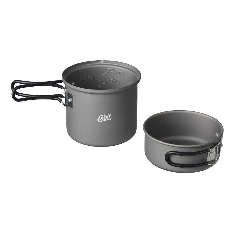 Туристична каструля Esbit Aluminium Pot 1000 складається з додаткового елемента, що є кришкою, яка також служить меншою кострулею об'ємом близько 475 мл. Обидві посудини виготовлені з анодованого алюмінію, а до стін кріпляться міцні ручки з нержавіючої сталі з функцією складання. Кожна ручка також покрита силіконовим покриттям, яке впливає на протиковзкі властивості і захищає руки від більш високих температур. Горщик більшого розміру, що входить до туристичного набору Esbit Aluminium Pot 1000, має чітку шкалу об'єму в мл та унціях, що дозволяє точно підібрати пропорції. Все це було поміщено у легкий чохол із синтетичної сітки.