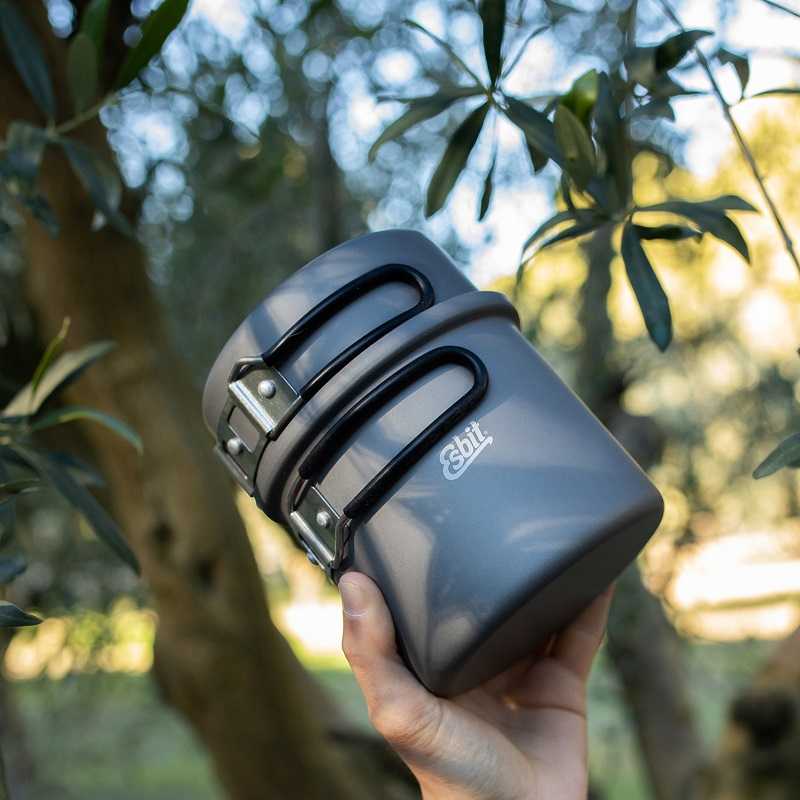 Набір туристичного посуду Esbit Aluminium Pot 1000 ml (PT1000HA) призначений для мандрівників та любителів кемпінгу. З його допомогою можна приготувати гарячу їжу на одну-дві людини, а конструкція відмінно поєднується з кишеньковою плитою esbit і твердопаливними пігулками німецького бренду Esbit.