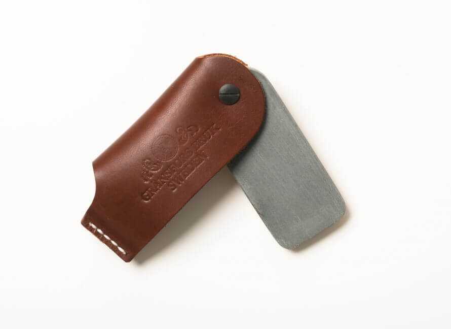 Форма точильного камня удобна в использовании, и его легко держать в руке. Это позволяет относительно просто затачивать кромку по существующей фаске и углу заточки. Точильный камень поставляется в футляре из кожи растительного дубления с небольшим ремешком для удобного крепления к брюкам или рюкзаку, идеально подходящему для ношения.