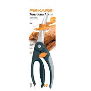 Ножиці для птиці Fiskars Functional Form™ (1003033) сильні ножиці для зняття шкіри, оброблення та оздоблення домашньої птиці та дичини. Вигнуті профільовані леза полегшують різання та мають паз для різання кісток. М'які ручки ручки SoftgripTM зі зменшуючим тиском поверхнею Softouch® добре підходять як для правшів, так і для шульг. Ручка-петля для зручного користування. З блокувальним механізмом, керованим великим пальцем. Регульований натяг леза.
