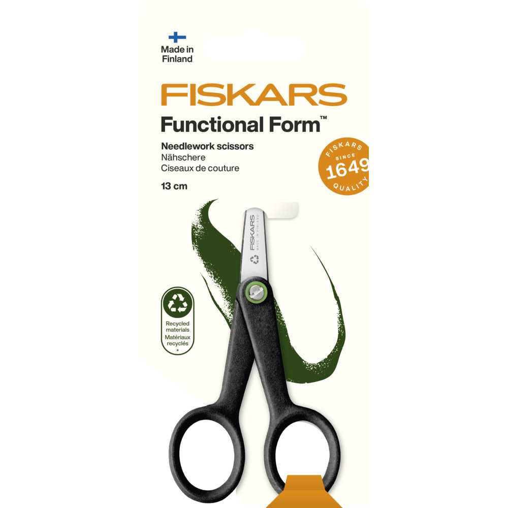 Ножниці для вишивання Fiskars Functional Form™ ReNew 13 см (1074541) ідеальний інструмент для точної та делікатної різки, який особливо оцінить любителі вишивки та інших робіт, що потребують деталізації. Завдяки ергономічному дизайну та переробленим матеріалам ножниці екологічно безпечні та зручні у використанні. Високоякісні лезвия з переробленої нержавіючої сталі забезпечують острую і точну резку навіть в дуже вузьких місцях. Ножниці виробляються на екологічно сертифікованому заводі у Фінляндії і підходять як правшам, так і левшам .
