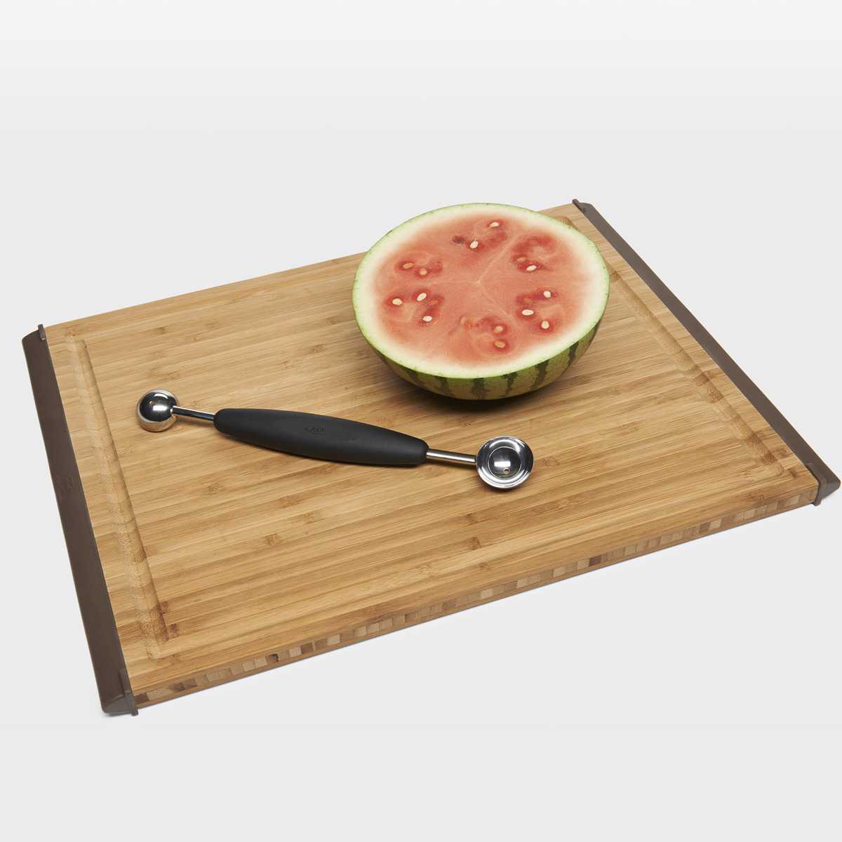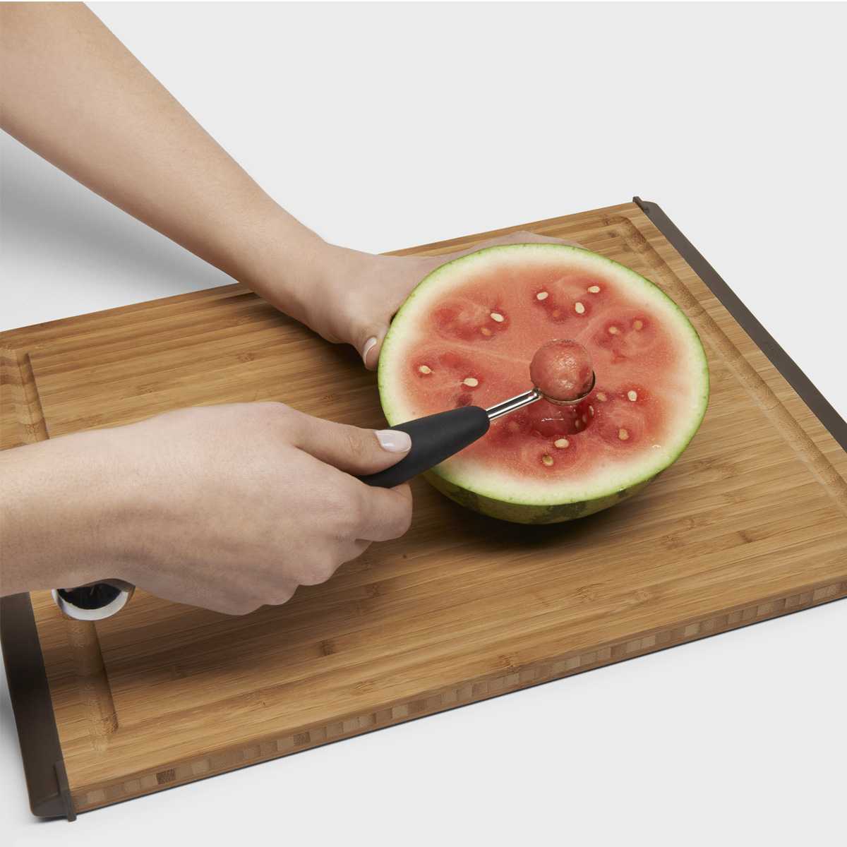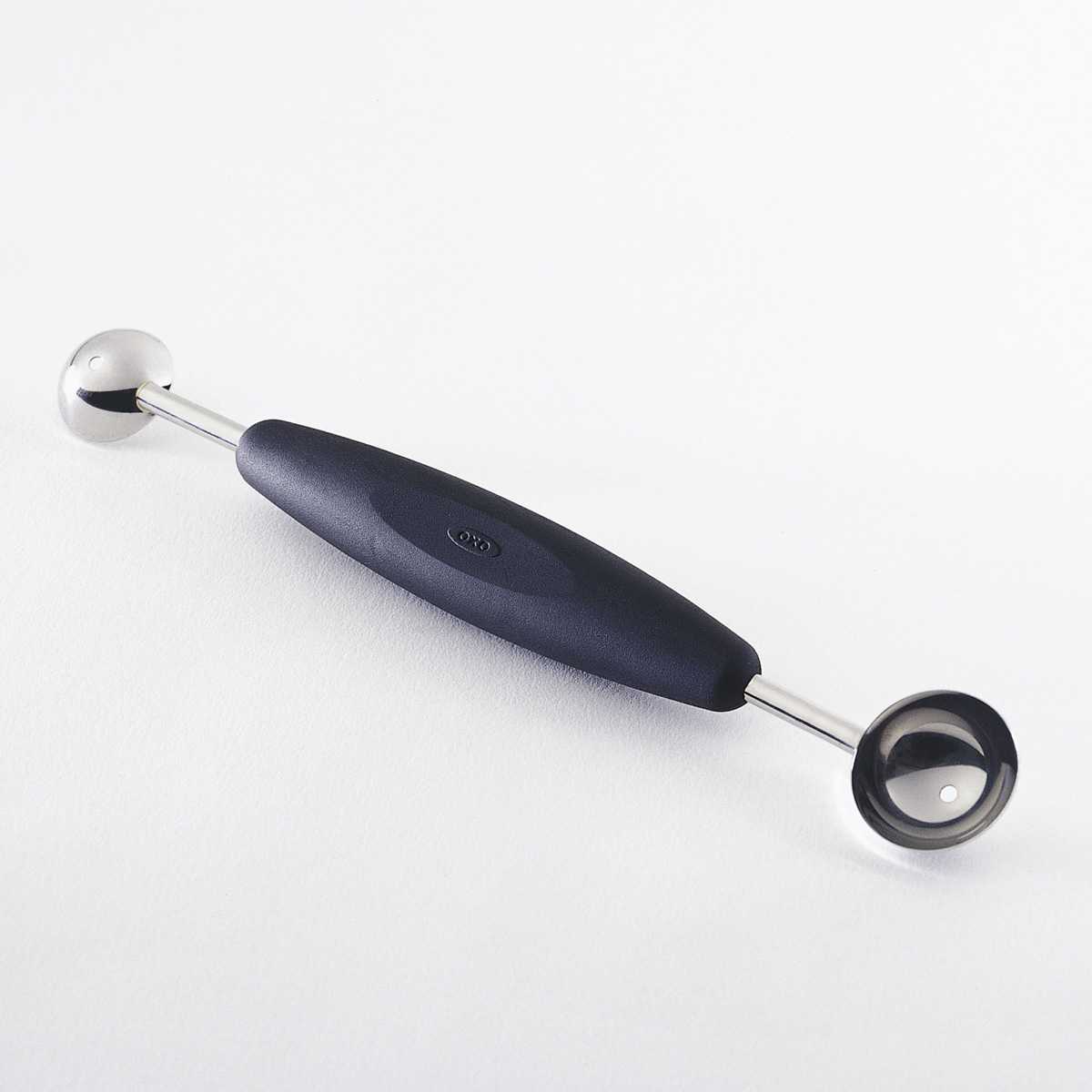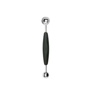 Ложка нуазетка OXO Good Grips (39781) – сучасна ложка для нарізки фруктових та овочевих кульок, наприклад, ананаса, кавуна, гарбуза, груші або дині. Вона виготовлена з нержавіючої сталі та має м'яку ергономічну ковзну ручку, що дозволить вам комфортно користуватися нею без ризику випадково вислизнути з руки. Завдяки двом наконечникам різного розміру вона дозволить нарізати два розміри кульок без необхідності використання додаткового аксесуара. Ця ложка чудово підійде для гарної прикраси десерту чи салату.