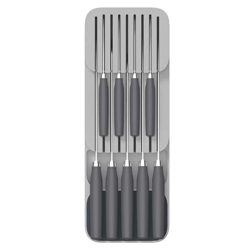 Органайзер для ножів Joseph Joseph Drawerstore™ (85120), який економить місце в ящику, призначений для 9 ножів. Унікальна дворівнева конструкція - для ножів із короткими та довгими лезами (довжина: 23 см). Оснащений ковзними ніжками.