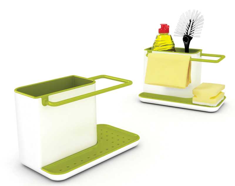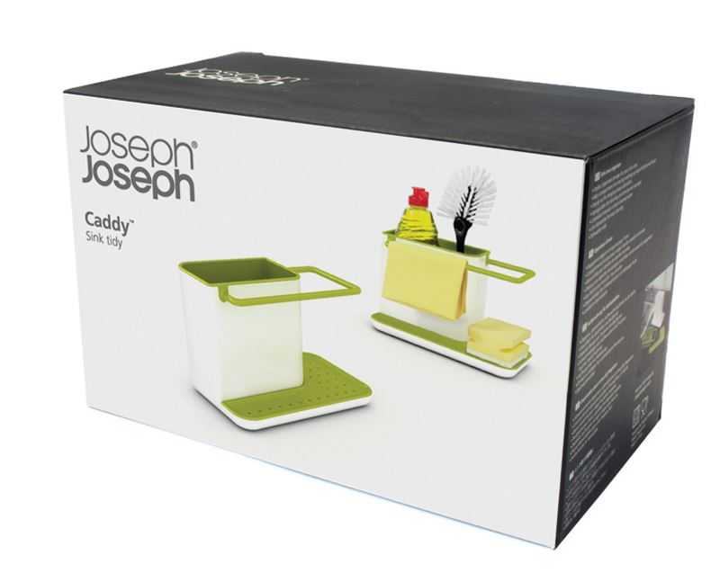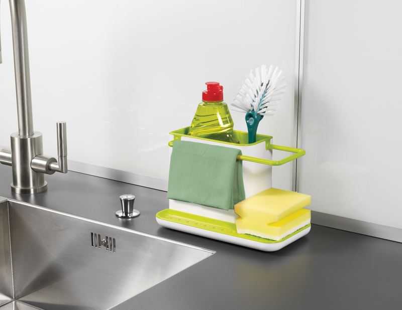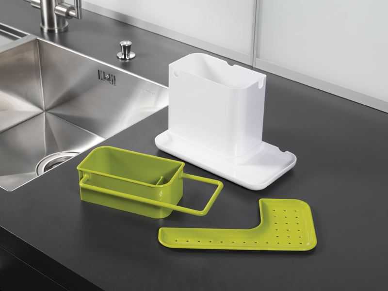 Органайзер для раковини Joseph Joseph Caddy™ (85021) ідеально підходить для організації посудомийного приладдя, містить окремі відсіки для пляшки з рідиною для миття посуду та щіток. Спеціальна вішалка для вологої тканини та місце для губки зі зливом, завдяки якій губка сохне та вода збирається у контейнері під нею. Весь контейнер можна легко розкласти для чищення. Ідеальне рішення, якщо довкола раковини не так багато місця.