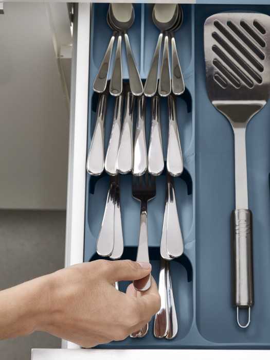 Органайзер Joseph Joseph Drawerstore™ Sky (85183) призначений для зберігання столових приладів, кухонного приладдя та корисних дрібничок. Ящик-органайзер Joseph Joseph складається з 5 менших і 3 великих відділень, що перекриваються. Поруч із кожним із відділень для столових приладів вигравіровано символ у вигляді ложки, вилки або ножа.