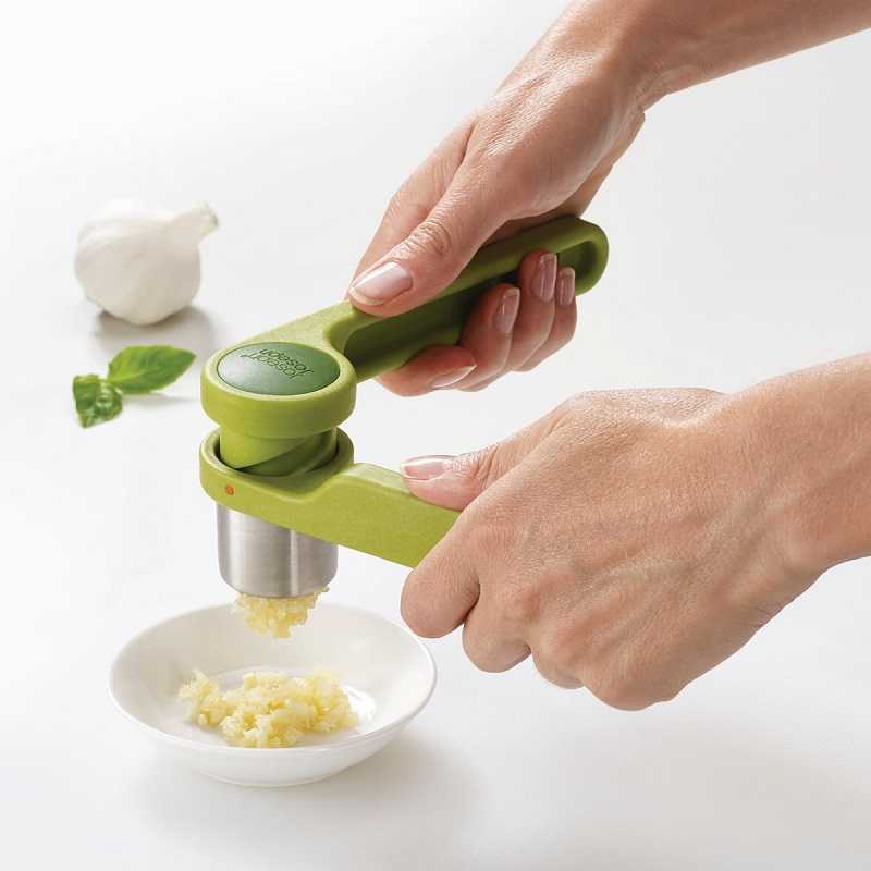 Прес для часнику Joseph Joseph Helix™ (20102) ергономічної форми, який є простим у використанні. Він використовується для одночасного тиску кількох зубчиків часнику. На відміну від вертикальних пресів, прес Helix використовує механізм, що обертається, для горизонтального пресування. Сила походить від плеча і оптимально розподіляється, щоб видавити зубчик часнику. Двокомпонентний прес виготовлений з нержавіючої сталі та нейлону. Обидві частини можна мити в посудомийній машині, тому їх легко мити.