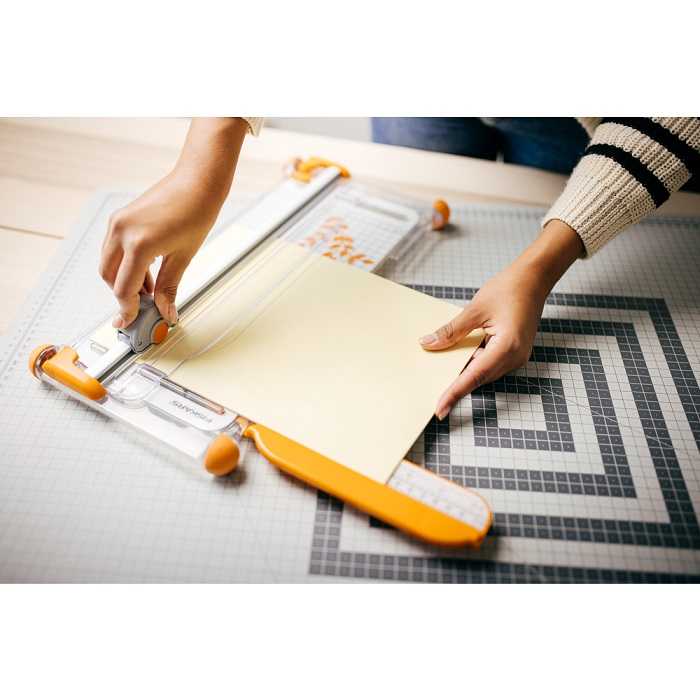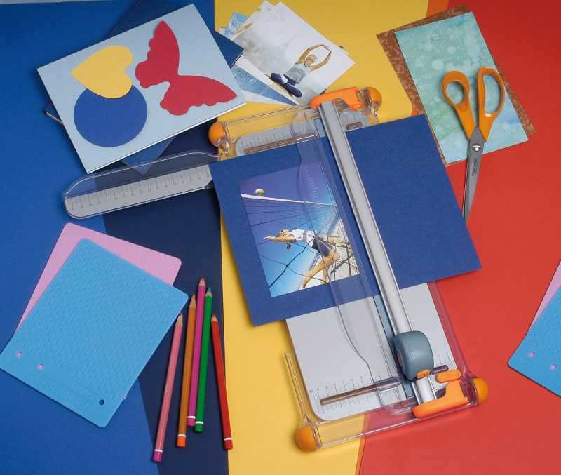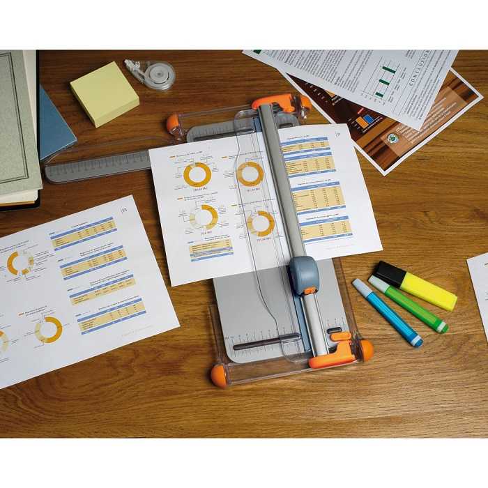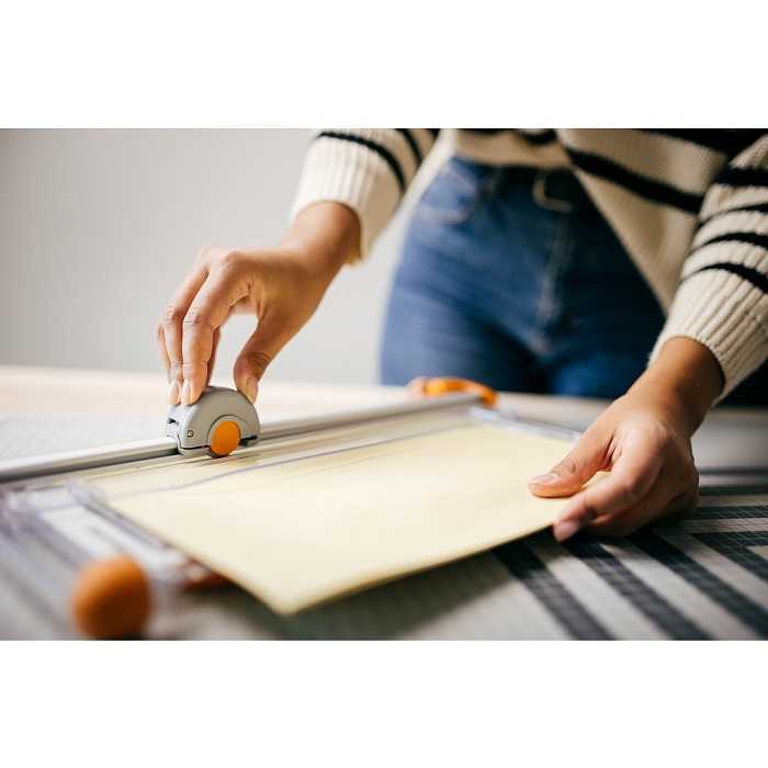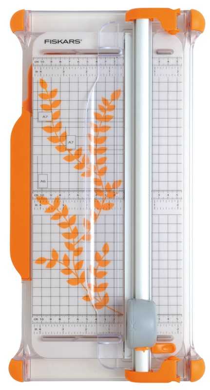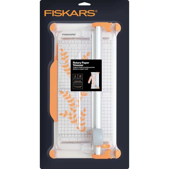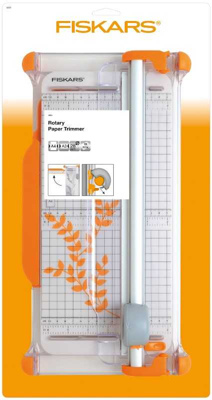 Настольный резак для бумаги Fiskars Portable Rotary Trimmer Ø28mm - A4 (1003921) с метрической и дюймовой разметкой защищенной от стирания. Картридж для лезвия показывает линию разреза. Одновременно можно разрезать до 10 листов бумаги плотностью не более 80 г/кв.м. Выдвижная линейка увеличивает ширину резака на 31 см. Прорезиненные ножки надёжно удерживают резак. Прозрачный держатель для бумаги защищает её от отпечатков пальцев. Многоразовое использование планки. Её можно переворачивать, используя с 2-х разных сторон.