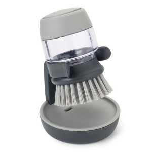 Щітка для миття посуду Joseph Joseph Palm Scrub™ (85005) Інноваційна щітка для миття посуду з підставкою. Для миття каструль, сковорідок та посуду. Складається з ємності для миючої рідини, щітки та основи зі зливом. Просто відкрутіть контейнер, налийте миючий засіб, закрийте його, натисніть верхню кнопку та вимийте посуд. Прозорі стіни дозволяють контролювати кількість рідини. Зберігання щітки щетиною вниз гігієнічніше - вода стікає на основу, не змочує стільницю, кисть швидше висихає. Все можна розібрати для прання – ручне прання.