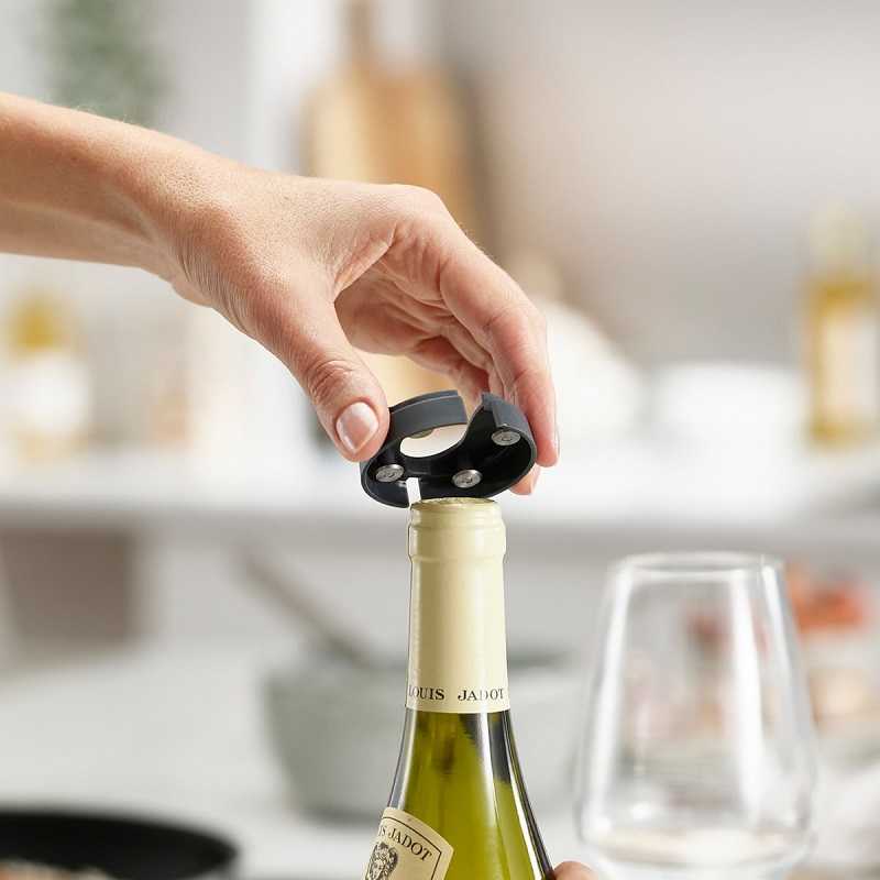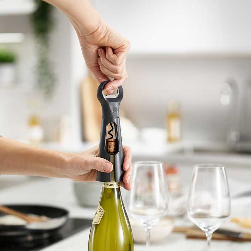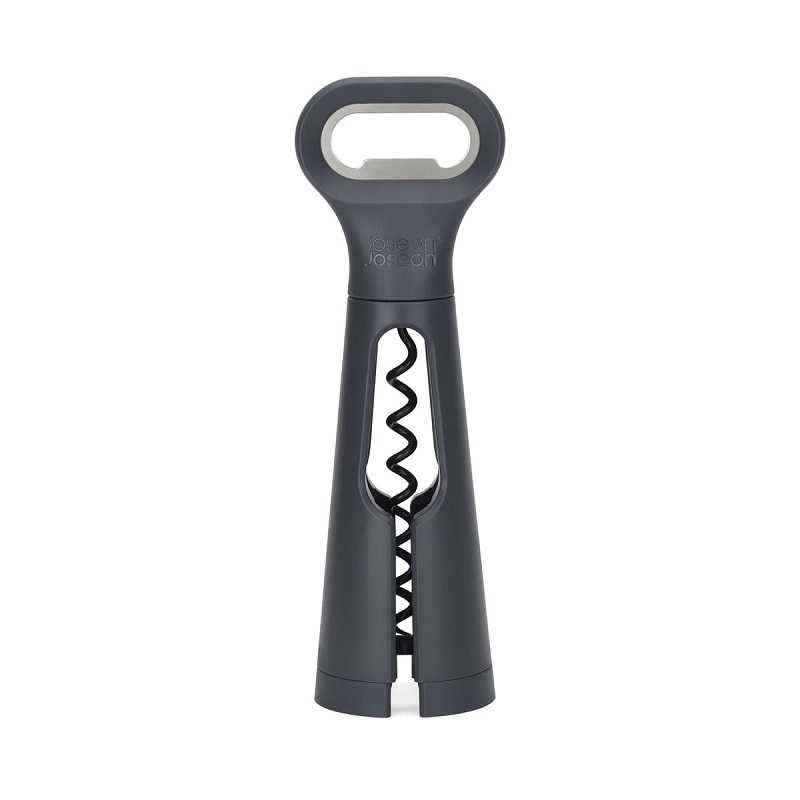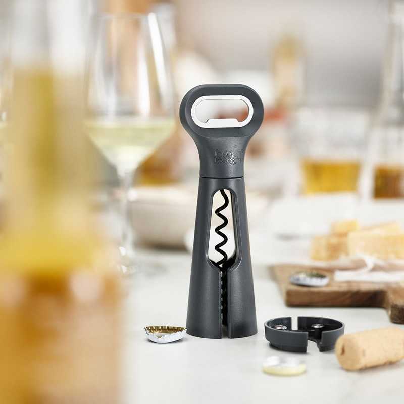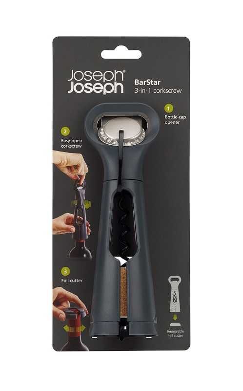 Штопор Joseph Joseph BarStar (20173) це практичний гаджет, який поєднує три інструменти для відкривання пляшок в одному компактному корпусі. Перший - це штопор з плавним ходом та різьбленням з антипригарним покриттям, який легко проникає у будь-яку пробку. На нижній стороні ножа є знімний різак для плівки із чотирма гострими ріжучими дисками. Зрештою, у штопора зверху є відкривачка для пляшок, за допомогою якої можна відривати кришки від пляшок.