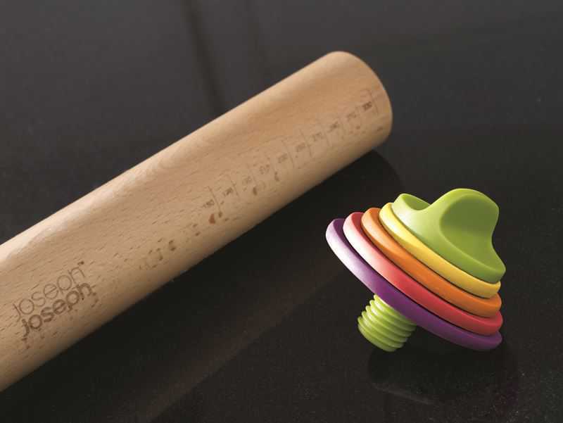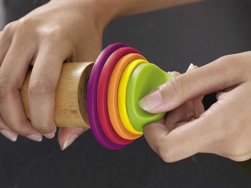 Скалка для теста Joseph Joseph Multi-colour (20085) поставляется с тремя наборами навинчивающихся дисков, с помощью которых валик можно регулировать по высоте теста на четырех уровнях: очень нежное (2 мм), тонкое (4 мм), среднее (6 мм) и толстое (10 мм). Пластиковые кольца не только удобны для приготовления пиццы или теста для пирожных, но и защищают столешницу от царапин. На валике еще есть размерная маркировка, чтобы тесто можно было сразу нарезать нужного размера.