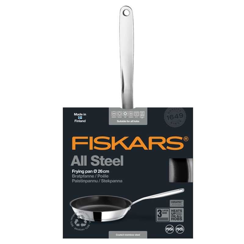 Сковорода Fiskars All Steel 26 cm (1023760) із нержавіючої сталі для особливих випадків. Антипригарне керамічне покриття Ceratecº робить смак їжі кращим. Товста тришарова основа оптимізована для ефективного та рівномірного нагрівання всіх варильних панелей.