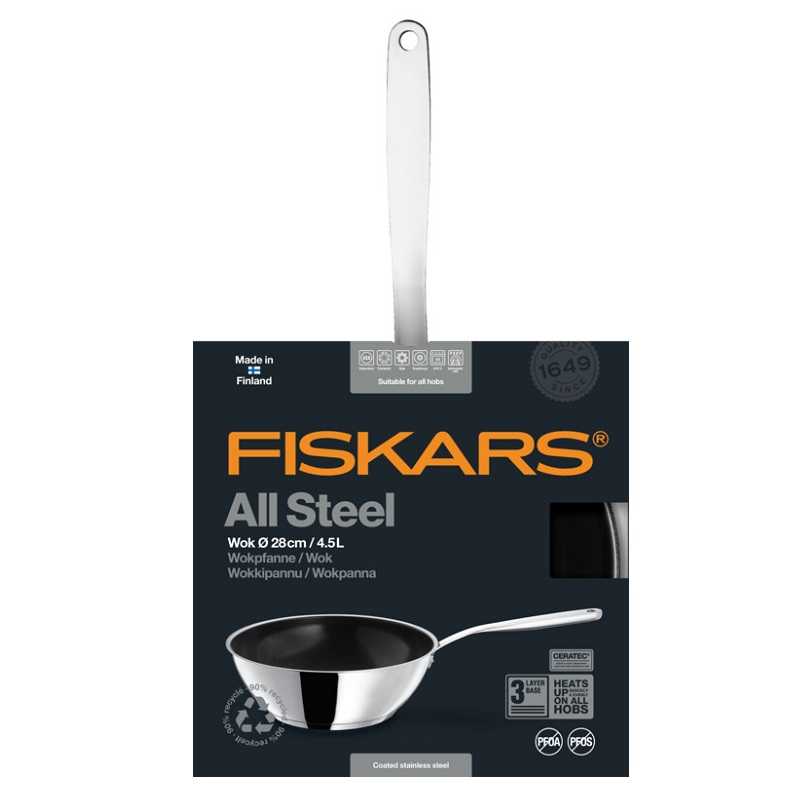 Сковорода WOK Fiskars All Steel 28 cm (1023763) із нержавіючої сталі для особливих випадків. Антипригарне керамічне покриття Ceratecº робить смак їжі кращим. Товста тришарова основа оптимізована для ефективного та рівномірного нагрівання всіх варильних панелей.