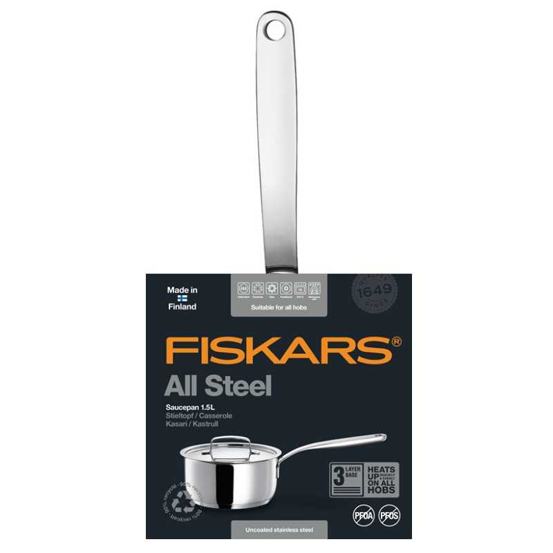 Сотейник Fiskars All Steel 1.5 L (1023765) із нержавіючої сталі для приготування їжі. Ручки з нержавіючої сталі та шкала виміру всередині. Ефективна тришарова основа працює на всіх панелях.