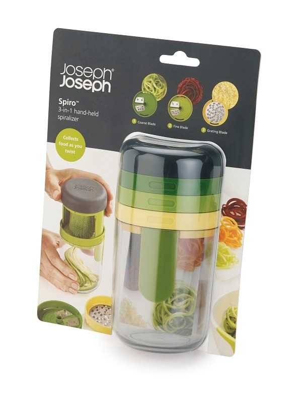 Спіральна овочерізка 3-в-1 Joseph Joseph Spiro™ (20105), яка спрощує подрібнення продуктів завдяки своїй ергономічній функції обертання. Продуманий дизайн робить різання та натирання простим і чистим завданням. Spiro складається з двох спіральних лез, великого та дрібного, терки та надзвичайно практичної ємності для збору, в яку потрапляють нарізані продукти. За допомогою лез та приємно м'якої ручки фрукти, овочі та салати можна легко нарізати або розрізати на пасма. Дві напрямні утримують їжу прямо під час нарізки.