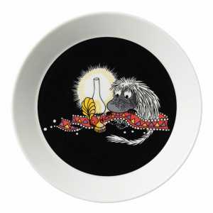 Тарелка Arabia Moomin Ancestor 19 cm (1019854) в черном цвете изображает особого предка муми-троллей, который живет в их доме за изразцовой печью. Волосатое ночное существо имеет обыкновение обновлять свою гостиную, переворачивая картины вверх ногами.