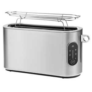 Тостер WMF Lumero (414190011) для підсмажування, розморожування та розігріву булочок, рогаликів, великих скибочок простого хліба та тостів (вміщує 2 штуки за раз). Оснащений насадкою, що дозволяє запікати, розморожувати або обережно нагрівати булочки або багети, шухлядою для крихт, який можна висунути за допомогою однієї кнопки.