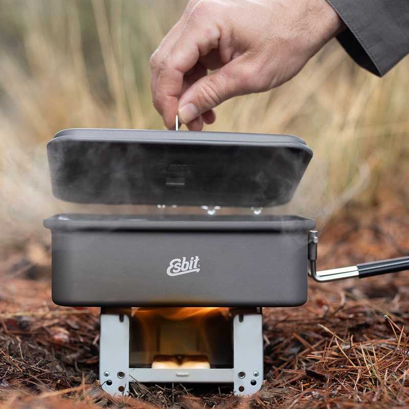Однією з переваг туристичної алюмінієвої каструлі Esbit 1200 є місткість, що поєднується з компактними габаритами, що дозволить помістити всередину невеликі упаковані продукти або плиту. Крім того, у комплекті є міцна кришка, що дозволяє гасити страви, яку можна повісити на борт судини.