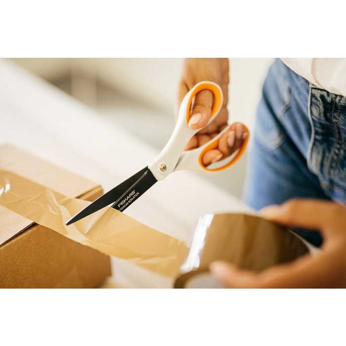 Універсальні ножиці Fiskars Titanium Non-stick™ 21 cm (1004721) леза з титановим покриттям довше залишаються гострими, а антипригарне покриття лез запобігає прилипанню до них більшості клеїв, таких як клейкі стрічки або самоклеючі етикетки. Вони в 3 рази твердіші за леза звичайних ножиць. Фасонні ручки із поверхнею Softgrip® для зручного захоплення. Леза легко та швидко чистяться. Регульований тиск леза. Ручки ергономічної форми.