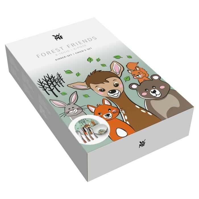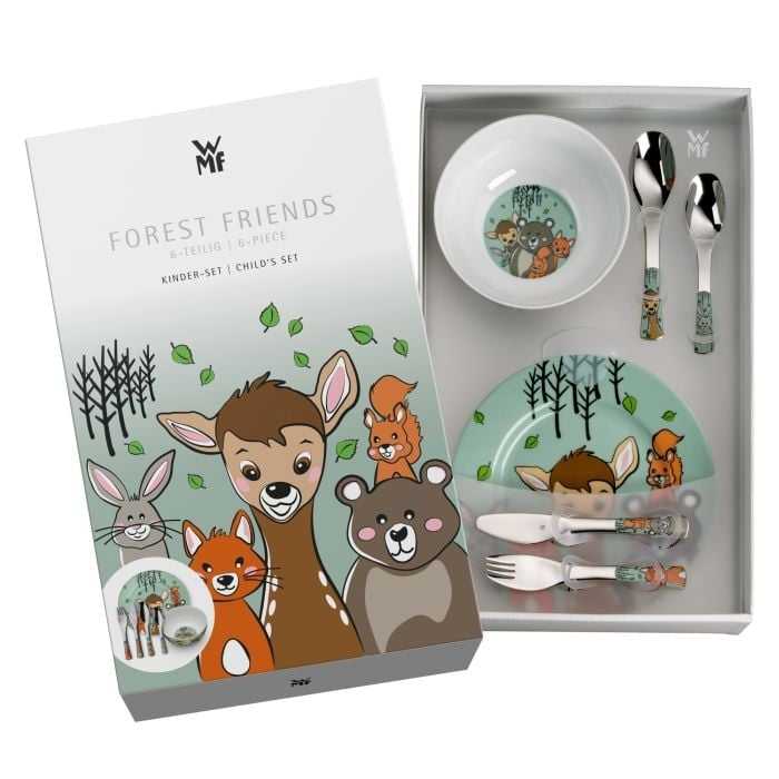 Набір посуду для дітей WMF Forest Friends (1286119964) з шести предметів, на якому зображена незвичайна група кращих друзів. Дизайн, зручний для дітей, дозволяє незалежності під час їжі і перетворює кожен прийом їжі в приєднання. Олень, медведь, лиса, кролик і білка з любов'ю примут вашу дитину у свій світ. У комплект входять вилка, нож, ложка, маленька ложечка, фарфорова тарелка і миска для дітей — ідеально підходять для відкриття радості самостійного прийому їжі.