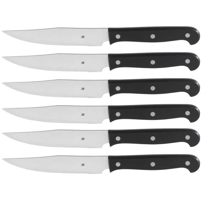 Набір ножів для стейку WMF Kansas 6 предметів (1283706096) ідеально підходять для того, щоб легко насолоджуватися всіма вашими улюбленими шматками м'яса. Відкрийте для себе досвід WMF в області ножів, які створені для того, щоб щодня з легкістю нарізати ніжні та соковиті шматки м'яса. Тонкі зубчасті леза виковані із цільного шматка спеціальної нержавіючої сталі, а потім загартовані цілком, щоб зберігати гостроту та еластичність з часом. Високоякісні пластикові ручки із заклепками добре збалансовані та мають ергономічну форму, що забезпечує виняткове захоплення.
