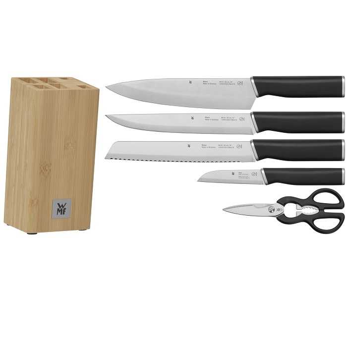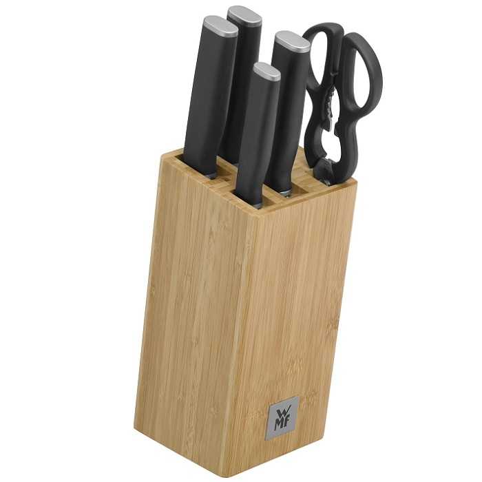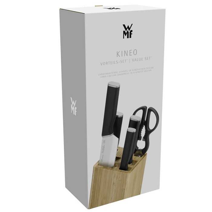 Набір ножів у блоці WMF Kineo (1882209992) відбиває дух цілісного дизайну бренду. Поєднуючи естетичну форму, функціональність і високу якість, він створює гармонійне ціле, що поєднує в собі давню традицію виробництва ножів WMF і новітні технології та тенденції дизайну.