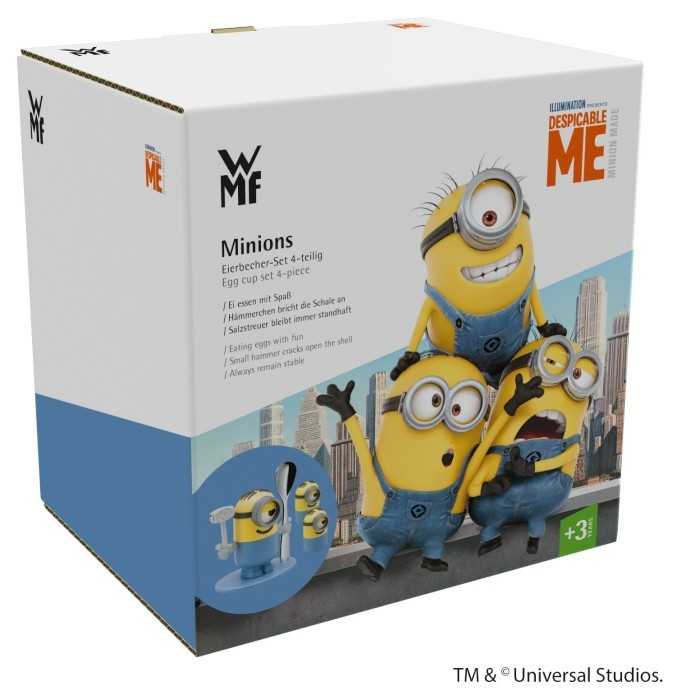 Підставка для яєць із сільничкою та перечницею для дітей WMF Minions (1286229990) у наборі все що потрібно, щоб з'їсти щойно зварене яйце. Той, що побільше, з основою та ложкою, призначений для того, щоб покласти яйце та насипати сіль та перець у дві маленькі фігурки.