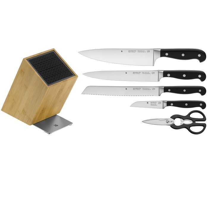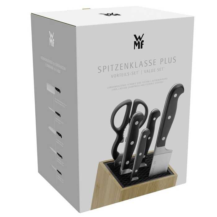 Набір ножів у блоці WMF Spitzenklasse Plus (1882159992) елегантна колекція для домашніх та професійних кухарів. Класичне поєднання сталі з чорною ручкою робить його ідеальним для будь-якої кухні та, безумовно, виправдає очікування при приготуванні страв.