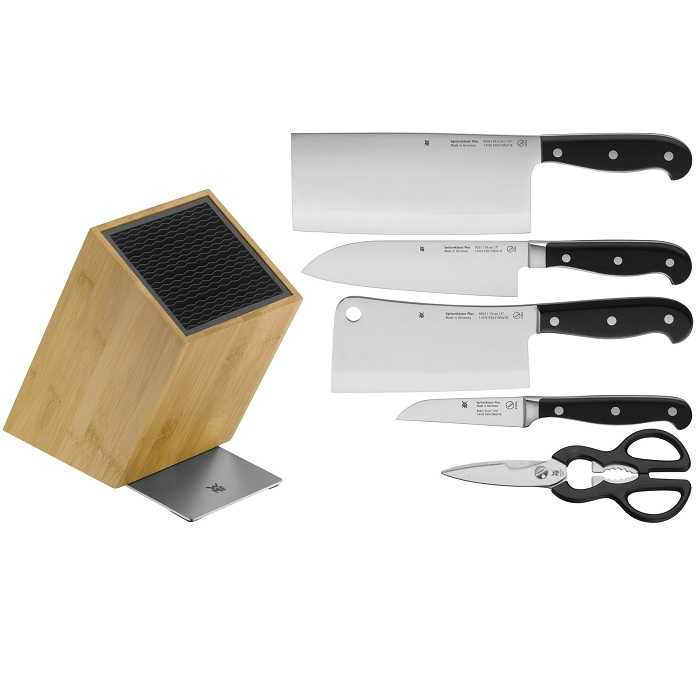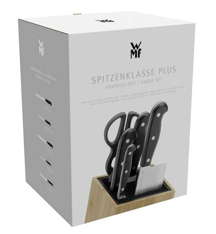 Набір ножів у блоці WMF Spitzenklasse Plus Asian (1882169992) елегантна колекція для домашніх та професійних кухарів. Класичне поєднання сталі з чорною ручкою робить його ідеальним для будь-якої кухні та, безумовно, виправдає очікування при приготуванні страв.