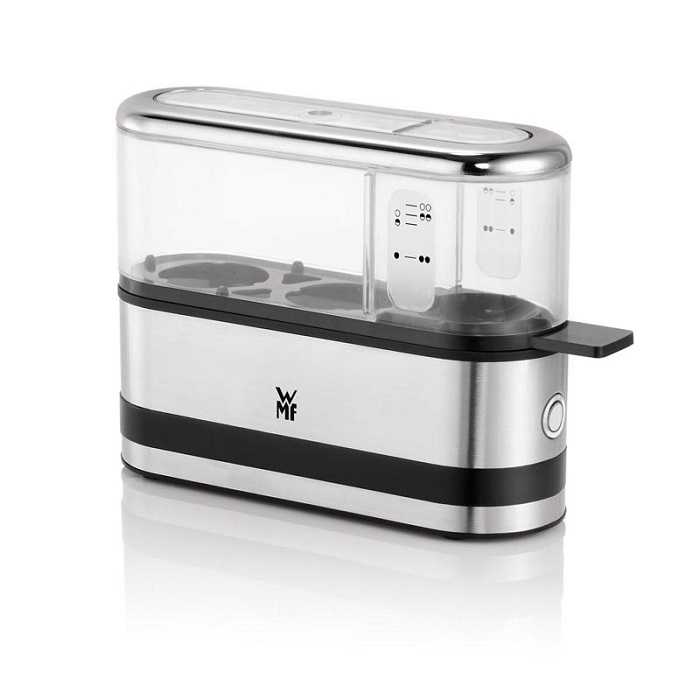 Яйцеварка WMF KÜCHENminis (61.3024.5381) экономит место и готовит одно или два яица для завтрака, размеры от S до XL. Прозрачная крышка из высококачественного тритана не содержит бисфенола А, стабильна и легко моется. Количество воды может быть измерено в зависимости от размера яйца и требуемой жесткости с помощью встроенной измерительной кружки. Как только яйца готовы, раздается звуковой сигнал.