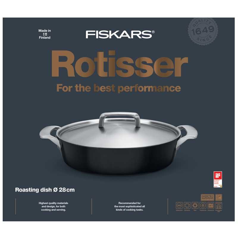 Сотейник Fiskars Rotisser Roasting dish 28cm (1023753) из алюминия с прочным антипригарным покрытием Hardtec Superior и крышкой из нержавеющей стали. Сочетание высокого качества материалов и долговечного дизайна. Сотейник с высоким бортиком, подходит для всех типов плит.
